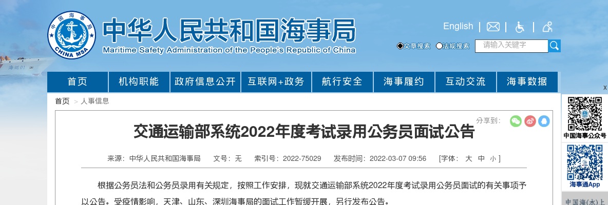 根据公务员法和公务员录用有关规定,按照工作安排,现就交通运输部系统2022年度考试录用公务员面试的有关事项予以公告。受疫情影响,天津、山东、深圳海事局的面试工作暂缓开展,另行发布公告。