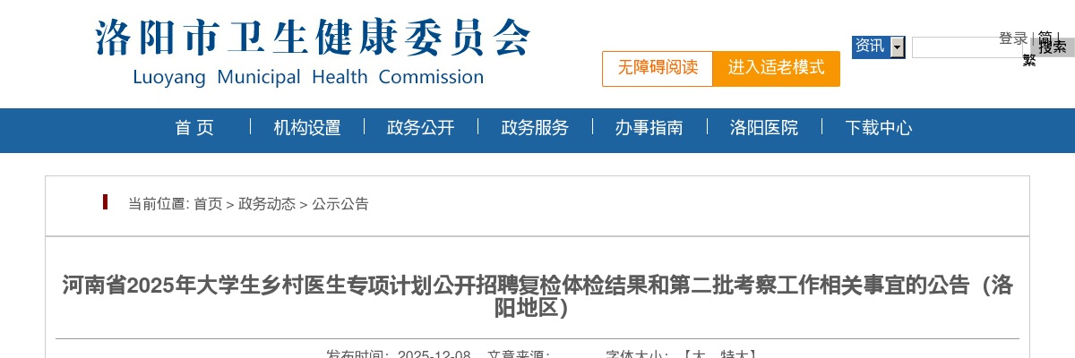 根据河南省卫生健康委等五部门《关于做好2025年大学生乡村医生专项计划公开招聘工作的通知》规定的程序和办法,现将河南省2025年大学生乡村医生专项计划公开招聘(洛阳地区)复检体检结果和第二批考察工作相关事宜公告如下: